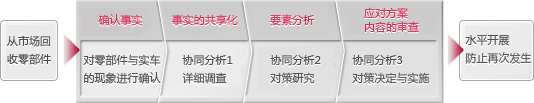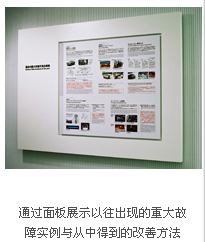 在上述展示區(qū)的鄰近地方還設置了對實際市場質量實施調查與進行改善活動的區(qū)域。相關的具體業(yè)務內容通過流程圖可一覽無遺。從顧客及銷售公司回收出現(xiàn)問題的零部件并開展調查,制定最終方案的流程一目了然。