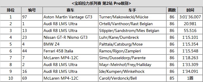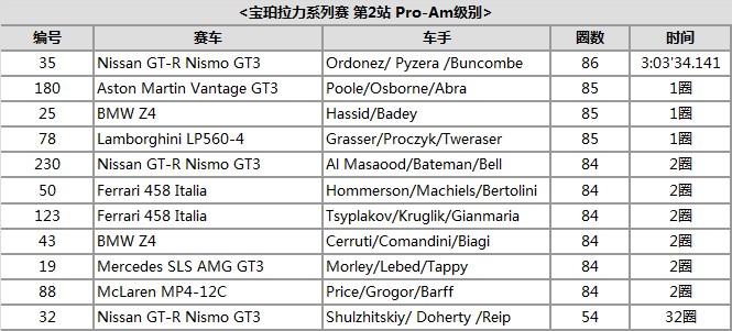 在剩余的GT-R賽車中,Buncombe出場負責剩余的賽事,最終在毫無威脅的狀態下走完全程,最終獲得綜合成績第10名,并在Pro-Am級別中奪魁。