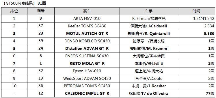 另外,Ronnie Quintarelli以預賽第11名的成績駕駛#23 GT-R起步。在前半程賽事中,持續與#24 GT-R展開激烈競爭,因此加速了輪胎的磨損。在第19圈的彎道頂點中一舉超越#24 GT-R,使得排位上升至第8位。在第30圈時為交接賽車和更換輪胎,Ronnie Quintarelli駕駛賽車進入維修站。柳田真孝駕駛賽車重返賽道后,由于前方賽車剮蹭等導致某些情況變動,另外加上降雨,使得賽道出現混亂情況。盡管如此,順利跑圈的#23 GT-R一鼓作氣將排位提升至第6位。在臨近賽事結束時,由于處于第一集團的賽車出現打滑等現象導致掉隊,#23 GT-R在第81圈時奮勇沖過終點,最終奪得第3名。另外,以預賽第9名的成績起步的#24 D'station ADVAN GT-R(安田裕信/Michael Krumm)由安田裕信擔任首發車手,安田裕信一直保持穩定的節奏堅守排位,在第30圈進站維修時與Michael Krumm進行了賽車交接。Michael Krumm負責較長賽道(負責圈數),最終奪得第5名。他感慨地說:“比賽臨近尾聲時下雨,我駕車進站維修并更換了輪胎,面對半濕的路面輪胎充分發揮了性能,最終我以第5名的成績完成比賽,感覺很好。”