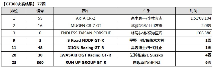 在有4輛NISSAN GT-R NISMO GT3參賽的GT300級別賽事中,以預賽第5名成績起步的#3 S Road NDDP GT-R(星野一樹/佐佐木大樹)最終奪得第9名,其他3輛賽車最終也堅持完成比賽。