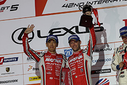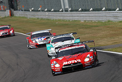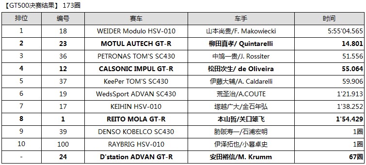 整個(gè)周末鈴鹿賽道的天氣晴朗,在進(jìn)行決賽的星期日早上雖然天氣被云彩覆蓋,但比賽即將開始前云團(tuán)散開,天氣進(jìn)一步晴朗。中午12點(diǎn)半時(shí)盛夏的天空下一片云彩都沒(méi)有,決賽開始時(shí)的氣溫為32度,路面溫度達(dá)50度。在正式預(yù)賽中奪得GT500級(jí)別桿位的#23 MOTUL AUTECH GT-R(柳田真孝/ Ronnie Quintarelli)由Ronnie Quintarelli擔(dān)任首發(fā)車手。Ronnie Quintarelli一直以較快的圈速保持著頭名的位置。但是之后由于無(wú)法發(fā)揮速度性能,被#18 HSV-010和#36 SC430趕超。因此,車隊(duì)為了稍微縮短最初設(shè)定的行程,對(duì)作戰(zhàn)方案進(jìn)行了調(diào)整。在第29圈結(jié)束時(shí),Ronnie Quintarelli駕車進(jìn)入維修站,并與柳田真孝交接了賽車。接手賽車的柳田真孝頑強(qiáng)拼搏,在常規(guī)維修站作業(yè)結(jié)束時(shí)排名已恢復(fù)至第6位。之后柳田真孝一直堅(jiān)持跑完65圈,使得最初設(shè)定的4次進(jìn)站維修/5停的組合方案得以實(shí)現(xiàn)。當(dāng)柳田真孝再次與Ronnie Quintarelli交接賽車之后不久,安全車(SC)進(jìn)場(chǎng)。眾多賽車以此為契機(jī)駕車進(jìn)入維修站,賽車排位出現(xiàn)大幅更替的情況,Ronnie Quintarelli排位上升至第2位。雖然安全車進(jìn)場(chǎng)時(shí)#1 REITO MOLA GT-R(本山哲/關(guān)口雄飛)處于首位,但由于在進(jìn)站維修的時(shí)間方面未掌握好,被處以駕車通過(guò)維修區(qū)的懲罰,因此排位下跌,Ronnie Quintarelli憑借該機(jī)會(huì)成功重返頭名寶座,并再次與柳田真孝進(jìn)行賽車交接。但柳田真孝駕車駛出維修站不久,與GT300賽車發(fā)生意外剮蹭,受困于無(wú)法提速的柳田真孝被#18 HSV-010趕超。盡管面臨困境,但柳田真孝依然頑強(qiáng)努力,最終勇奪第2名。