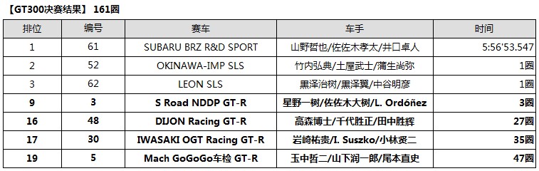 在有4輛NISSAN GT-R NISMO GT3參賽的GT300級(jí)別賽事中,以預(yù)賽第2名成績(jī)起步的#3 S Road NDDP GT-R(星野一樹/佐佐木大樹/Lucas Ordonez)最終獲得第9名。