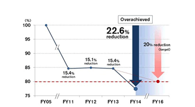 日產(chǎn)汽車實現(xiàn)二氧化碳排放降低進程(設定2005財年二氧化碳排放量為100%)