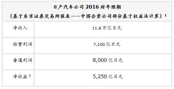 根據管理層預估報表(含日產汽車公司在中國的經營業績),日產汽車公司2016財年前三季度的凈收入達90,100億日元。經營利潤達6,019億日元,經營利潤率為6.7%。