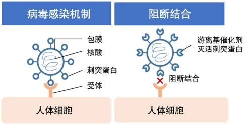 通過針對該技術(shù)應(yīng)用效果的研究發(fā)現(xiàn),游離基催化劑通過有氧氧化生成的氧銨鹽可以將病毒表面蛋白質(zhì)進(jìn)行氧化并滅活,從而降低病毒與靶細(xì)胞結(jié)合的能力。尤其是當(dāng)作用于2型SARS冠狀病毒(SARS-CoV2)刺突蛋白的受體結(jié)合區(qū)域時,可明顯減少刺突蛋白與受體的結(jié)合(見下圖)。通過貓冠狀病毒(Feline coronavirus)研究其對貓腎細(xì)胞的感染活性,發(fā)現(xiàn)細(xì)胞中與感染相關(guān)的形態(tài)學(xué)改變得到了明顯抑制。