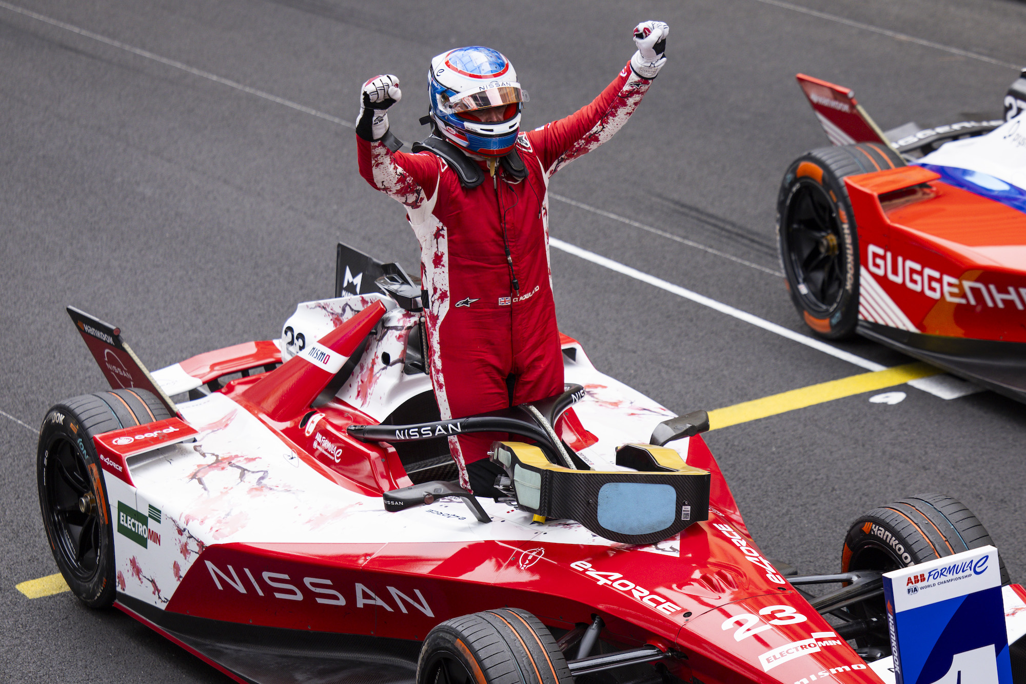 正賽中,羅蘭德作為車手積分榜的領(lǐng)跑者,在濕滑且棘手的賽道保持了自己的位置,但隨后因周圍車手啟用攻擊模式(Attack Mode)而暫時落至第二名。他展現(xiàn)出卓越的速度,成功抵擋住了競爭對手的攻勢,并在第18圈激活了他本場首次、時長四分鐘且額外增加50千瓦功率的攻擊模式(Attack Mode)。盡管這位英國車手因需要不得不讓回一個位置,但他奮力拼搏,最終奪得亞軍。
