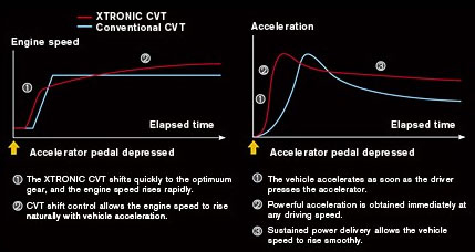 XTRONIC CVT通過對滑輪及鋼帶進行改良及AFT的高性能化,從低檔 位及高檔位大幅度改變了變速比。其作為1.5~2.0L的變速器,實 現了令人難以置信的變速比幅度。其變速比的廣泛變化及控制高精 確度同時實現了優越的加速性能及油耗性能。