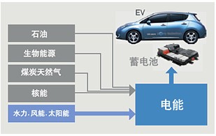 如果只有汽車變為清潔也不可能實現真正的低碳社會。同時也需要向社會普及太陽能發電和風力發電等可循環能源。EV的電池具有很大的可能性促進這個構想。日產汽車與眾多的合作伙伴同步試行這構想。其中一個就是與日本橫濱市和民間企業共同提倡的"橫濱智能城市項目"。這個項目包括,作為太陽能等供應量不穩定的可循環能源的蓄電設備,充分利用EV的電池。把EV規劃到供電網路內,就可實現安定供電。汽車有可能作為公共建設的一部分,迎接EV負責能源管理的時代。日產汽車將作為領軍者比任何公司都領先為實現可持續發展的社會做出貢獻。