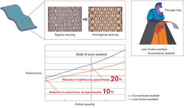 將座椅安全帶帶子的織法由正則織改為變化杉綾織(將邊緣部位及中央部位的織針進行優化分配的織法),以此使得安全帶帶子易于彎曲,減輕與穿孔部位的褶子阻力。