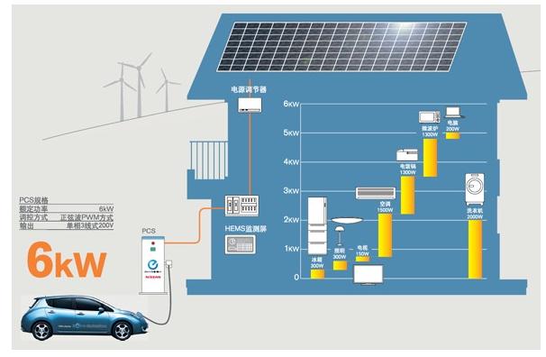 日產聆風的快速充電接頭,通過連接在住宅分電箱上的電力控制系統(PCS: Power Control System)便可為家庭供電。輸出功率可供住宅內所有電器同時使用,因此即便是上午或傍晚等使用電器較多的時段,也可確保電能的穩定供應。