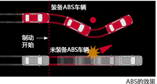在雪道及雨水打濕等易滑的柏油路面上緊急制動時,ABS可通過電控方式控制制動液壓,有效防止抱死現象。 ABS不僅可在制動時提高車輛穩定性,而且僅靠控制方向盤即可輕松避開障礙物。