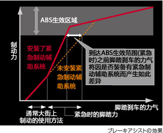 緊急制動輔助系統在遇到緊急情況需要急剎時,可協助駕駛者控制剎車,駕駛者只需要施加給制動踏板比以往更小的踩踏力,即可發揮最大的制動效果。當踩踏力超過某種程度時,緊急制動輔助系統立即生效。既能在市面道路行車時保持基本的制動特性,亦能在遇到緊急情況時僅靠較小力氣即可發揮汽車的最大制動力。通過ABS發揮以上效果,進一步提高了在突發情況中避免事故發生的能力。緊急制動輔助系統是日產汽車于1997年率先在全球投入實際應用的技術。
