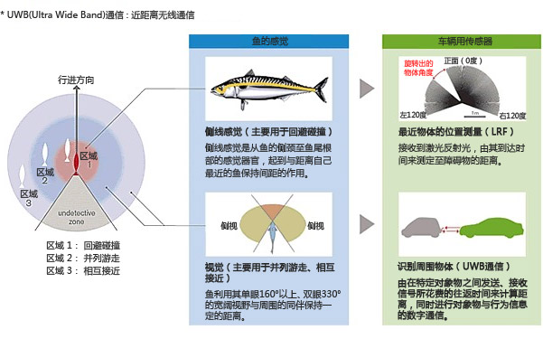 魚主要是以"側(cè)線感覺"和"視覺"作為傳感器來識別周圍的狀態(tài)。利用測量激光的反射光至障礙物距離的"激光測距儀"( LRF),實現(xiàn)了"側(cè)線感覺"的作用。此外,利用由發(fā)送脈沖信號并得到反射的時間差來測量對象物位置的 "UWB(超寬帶)通信技術(shù)*",實現(xiàn)了"視覺"的作用。將這兩個周圍環(huán)境識別技術(shù)和魚群游走三原則(回避碰撞、并列游走、相互接近)相結(jié)合,運用在機器人汽車上,就可以形成如同魚群一樣自由改變隊形的行駛。* UWB(Ultra Wide Band)通信:近距離無線通信。