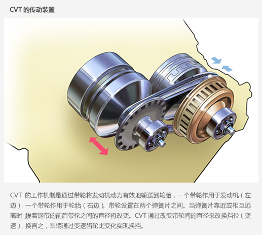 然而CVT卻大相徑庭。由于CVT是“無級”變速器,可以隨意設定變速齒輪比,這意味著汽車隨時可根據(jù)最有效的變速齒輪比行駛。即可在某個設定速度的行駛模式中應用,也可在加速過程中連續(xù)不斷選擇最佳變速齒輪比。