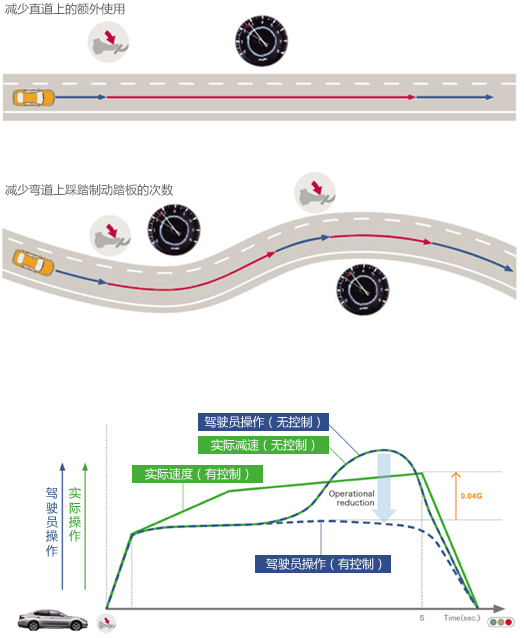 主動發動機制動系統可自動控制發動機的制動,根據行駛狀況適當減速,減少反復踩踏制動踏板的次數。同時,它可自動運作,減少轉彎時轉向和制動經常引發的不確定性,從而保證車輛順暢轉彎。雖然發動機轉速未增加,但其產生的效果和手動變速車輛的降擋減速相同。