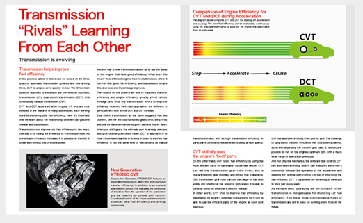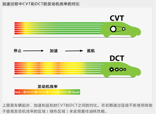 由于傳輸效率和發(fā)動(dòng)機(jī)效率提高,動(dòng)力系統(tǒng)的改進(jìn)會(huì)極大地影響車(chē)輛行駛里程,從而用任何一種變速器均可提升效率。然而,它們的主要方法卻有所不同。我們要特別關(guān)注DCT和CVT之間的差異。