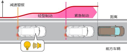 如果系統(tǒng)判定與車輛前方的車輛或行人存在相撞的風(fēng)險(xiǎn),它將通過視覺和音頻警報(bào)來提醒駕駛員,并進(jìn)行輕型自動制動。這是為了提示駕駛員采取措施避免碰撞。